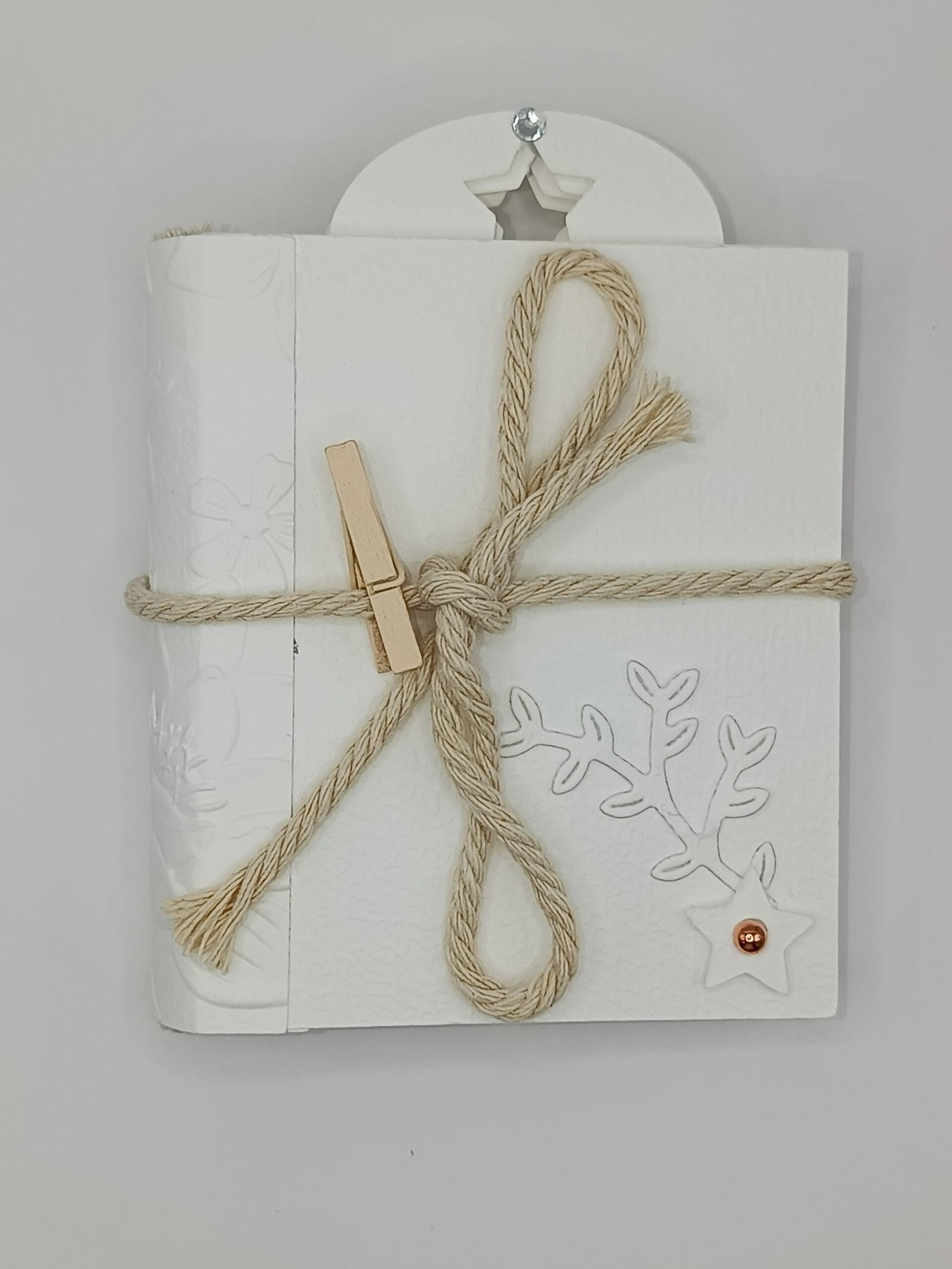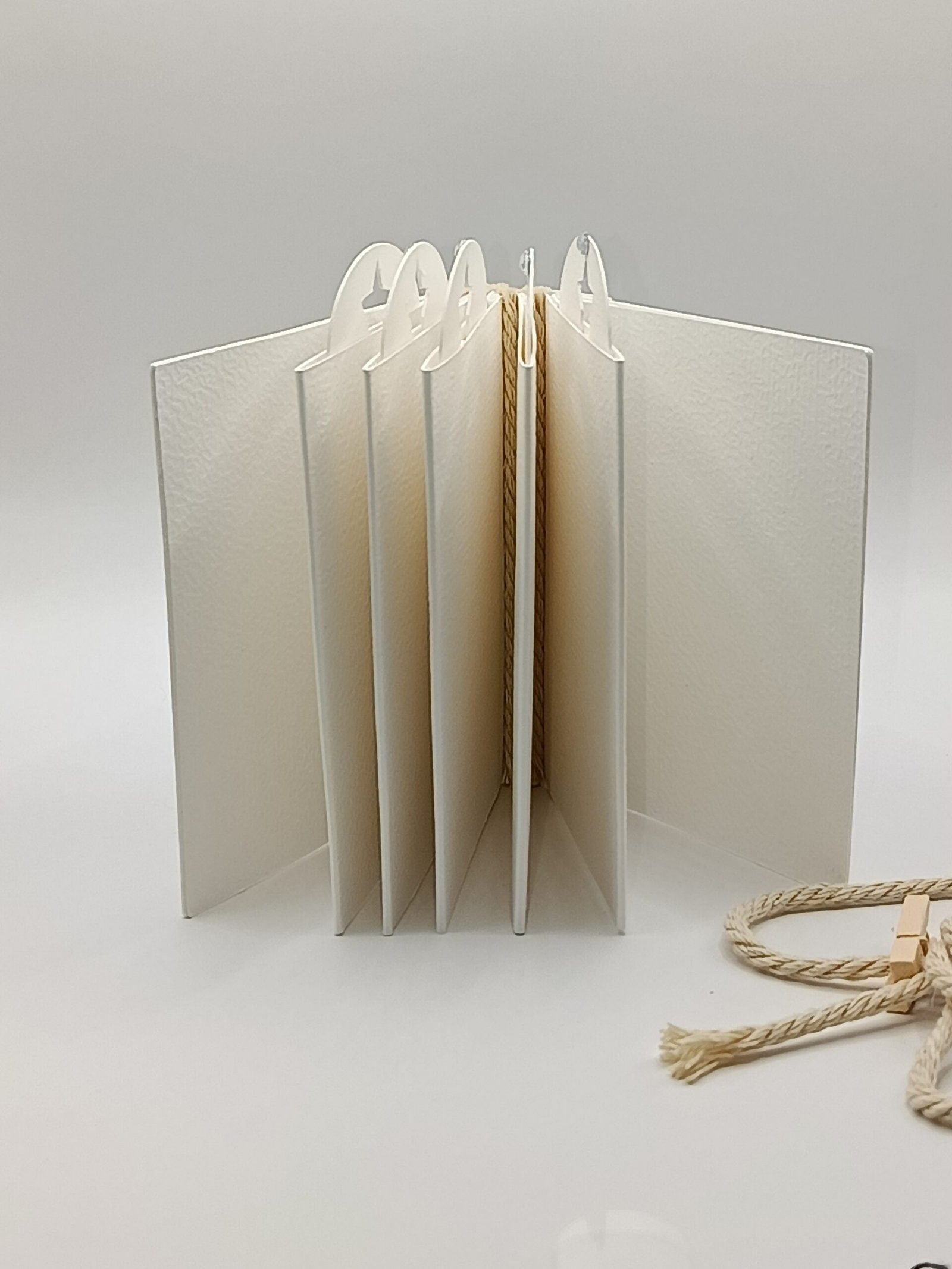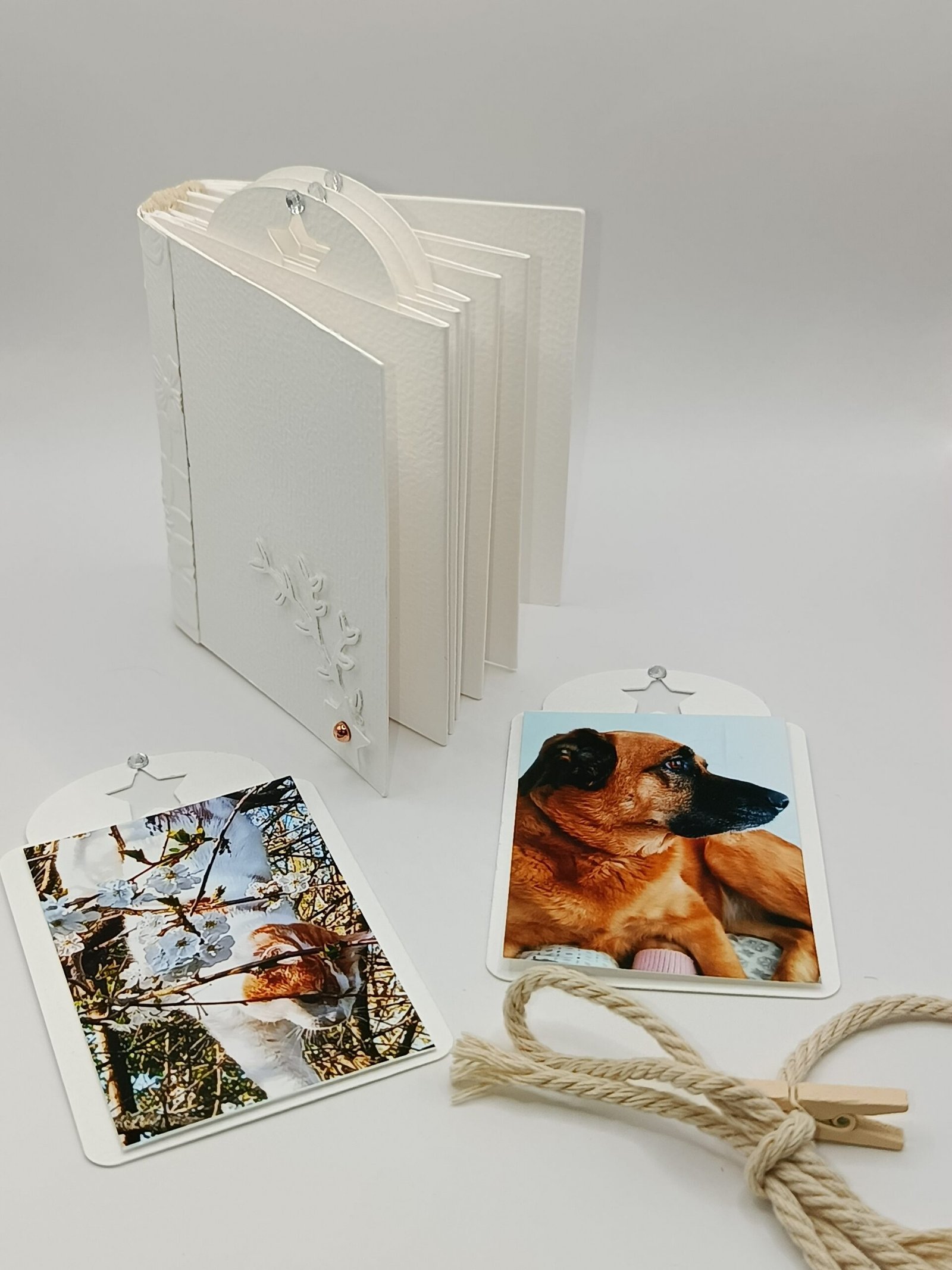 Mini-album photo artisanal blanc, fait main avec soin. Peut contenir jusqu’à 10 photos. Idéal pour vos souvenirs de naissance, mariage ou voyage.